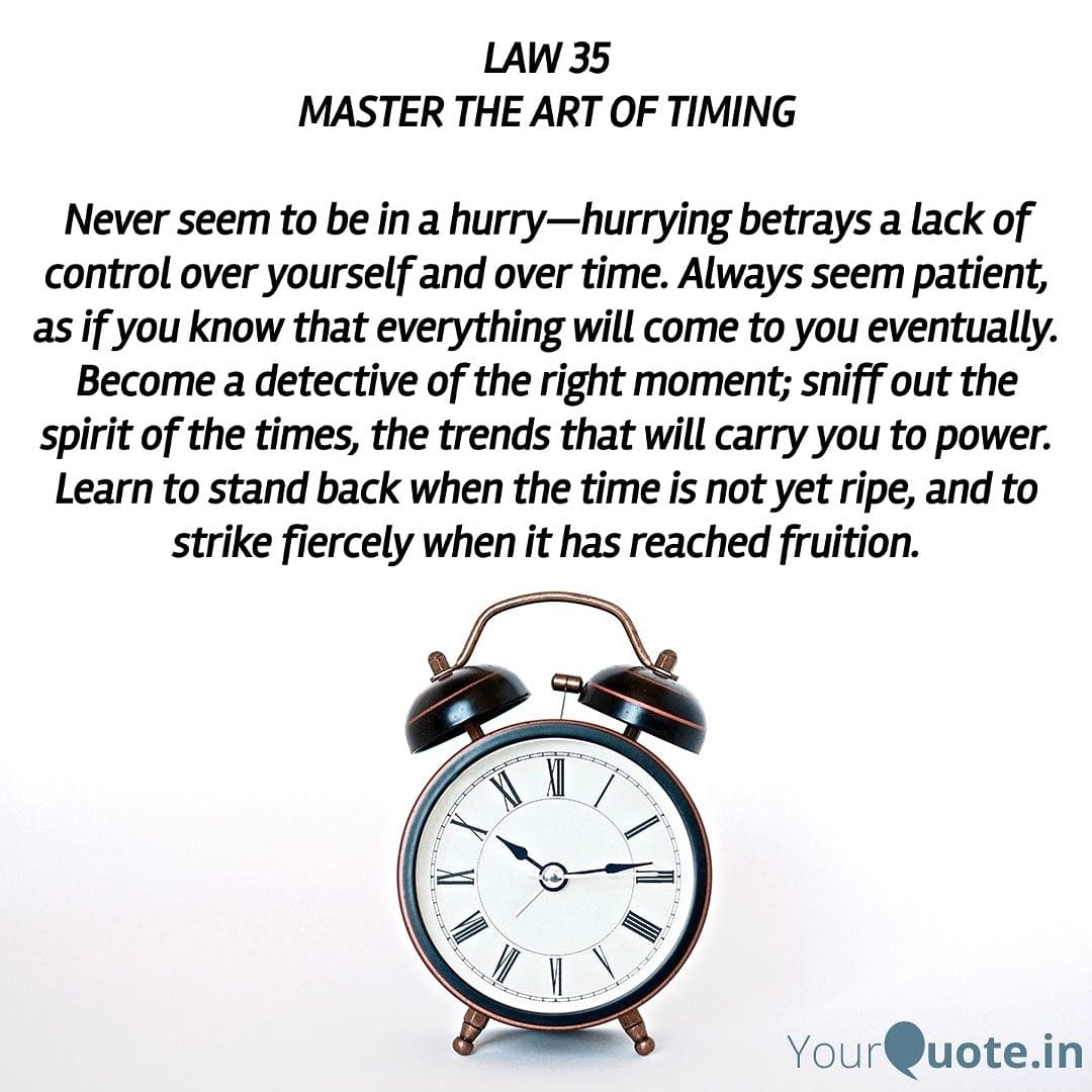 Sniff out the spirit of the times, the trends that will carry you to…. Master the art of timing. Hurrying betrays a lack of control over yourself, and over time. Always seem patient, as if you know that everything will come to you eventually. The first practical step towards this is taking autonomy of one's emotions. Master the art of timing. 07.01.2017 · master the art of timing. Learn to stand back when the. Learn to stand back when the time is not yet ripe, and to strike. 48 laws of power by robert greene | 0. Never seem to be in a hurry—hurrying betrays a lack of control over yourself, and over time.. Hurrying betrays a lack of control over yourself, and over time.